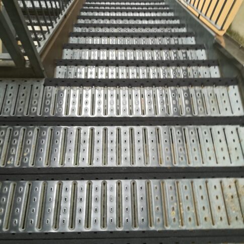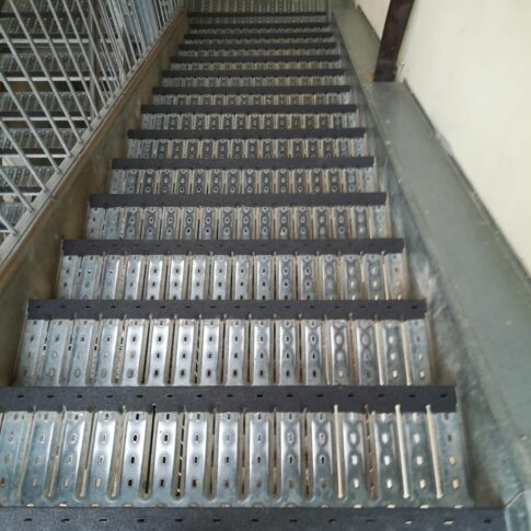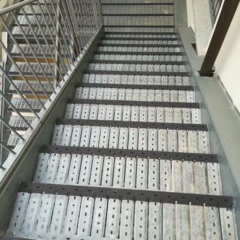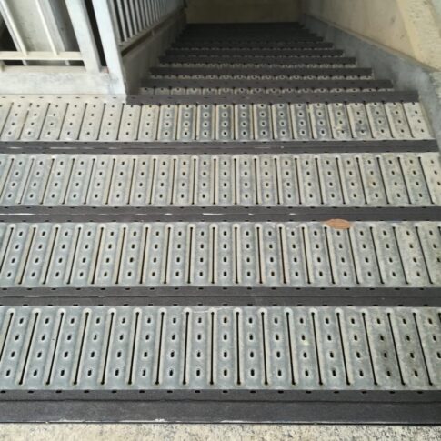 N.B. Da notare come la differenza di forma del rivestimento tra scala e piani consenta di capire anche con vista periferica la fine della scala, aumentando la sicurezza.
